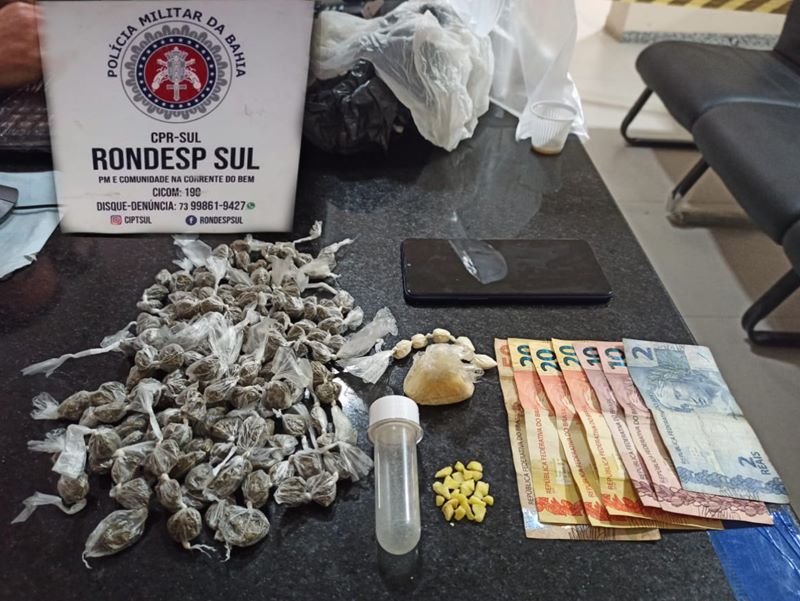 Eunápolis - No final da tarde de domingo (26), por volta das 17h30 as guarnições da RONDESP-SUL da Polícia Militar, apreenderam na Rua da Encosta no bairro Pequi, 157 buchas de maconha, 23 pedras de crack e R$ 132,00 em espécie.