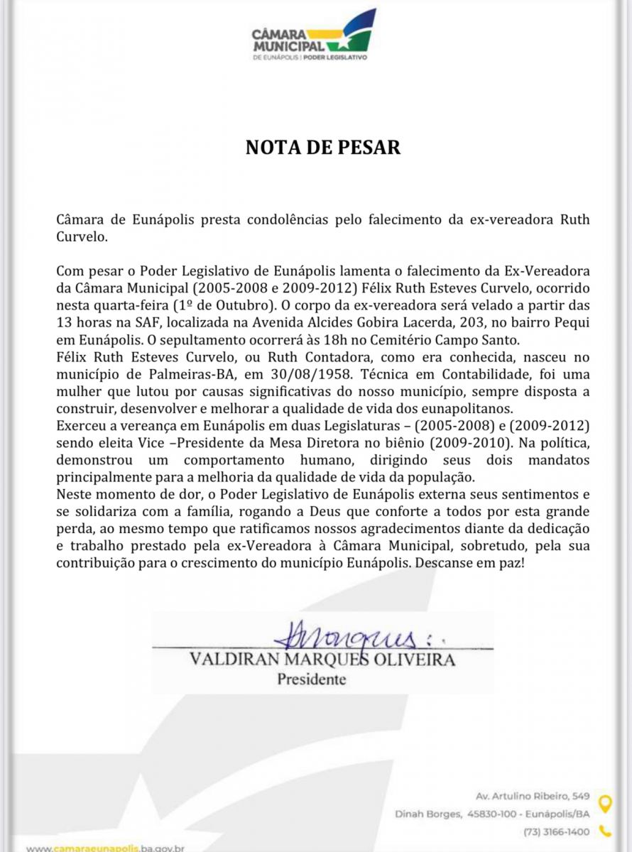 A Câmara Municipal de Eunápolis manifestou pesar pelo falecimento da ex-vereadora Félix Ruth Esteves Curvelo, conhecida como Ruth Contadora, ocorrido nesta quarta-feira (1º). Ruth exerceu dois mandatos no Legislativo (2005-2008 e 2009-2012), chegando a ocupar a vice-presidência da Mesa Diretora no biênio 2009-2010.