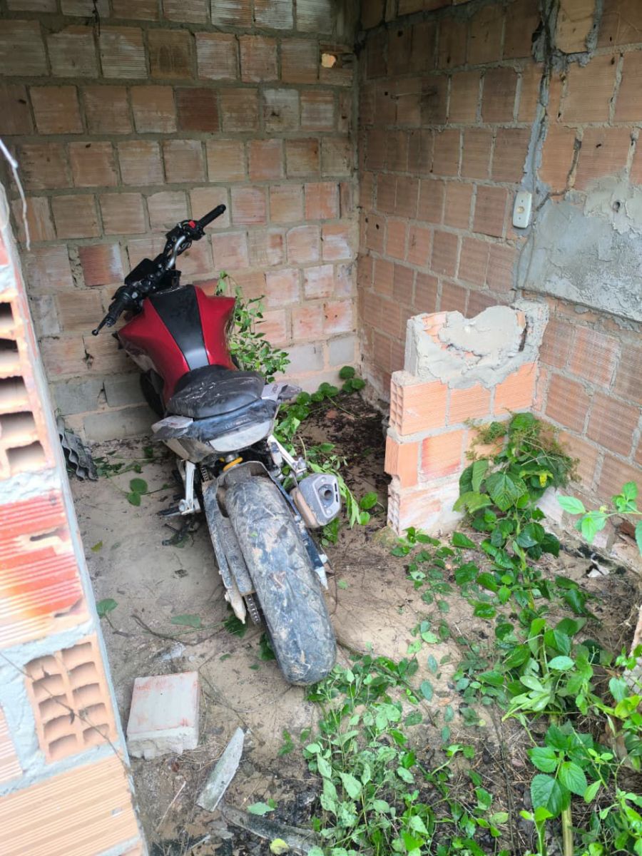 De acordo com a Delegacia Territorial, a equipe foi acionada após denúncia de um veículo abandonado na Rua Olavo Bilac. No local, os investigadores encontraram a motocicleta escondida nos fundos de uma casa abandonada, em meio à vegetação, indicando tentativa de ocultação.