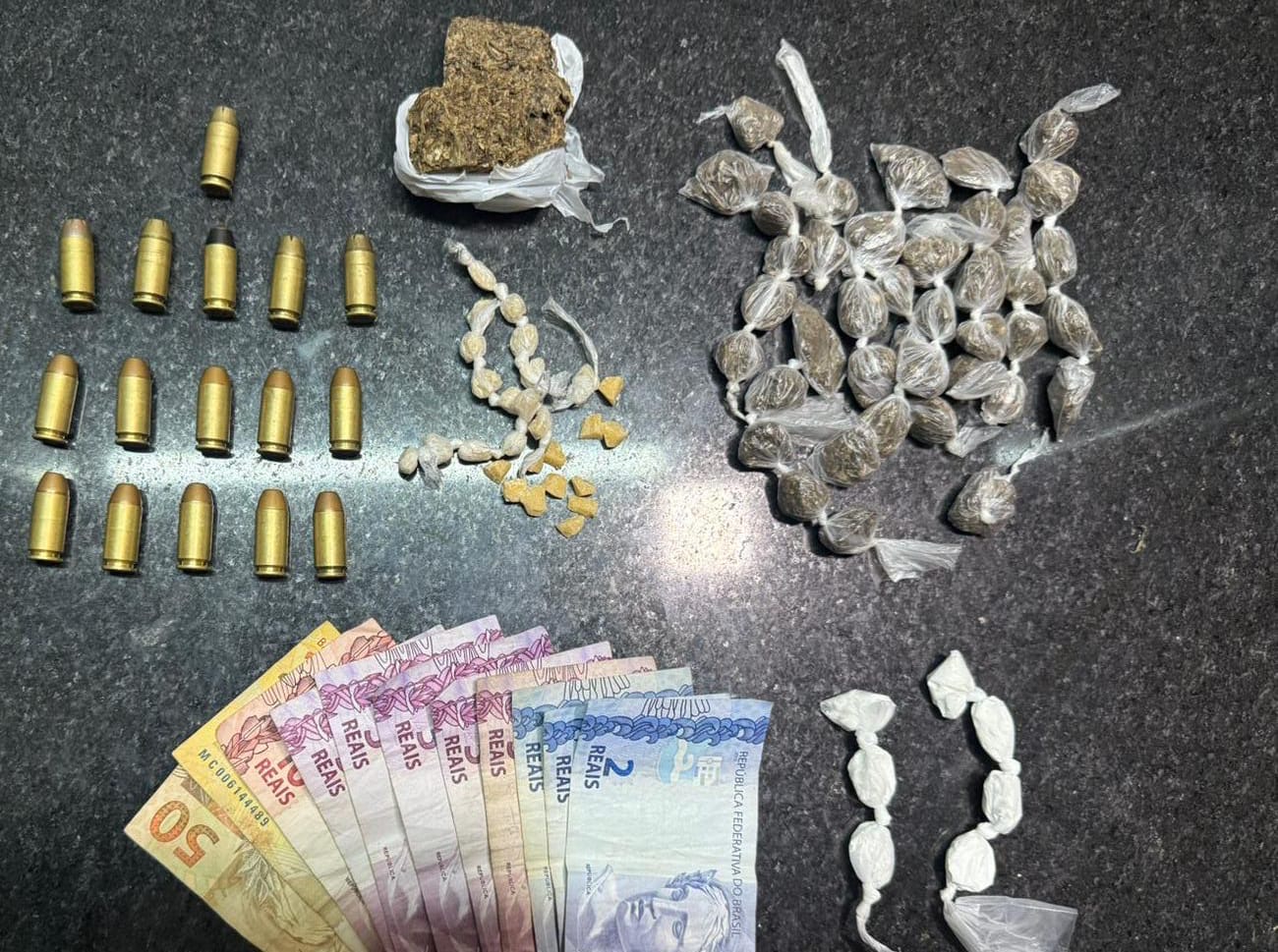 Durante a varredura, foram encontrados 40 buchas de maconha, um pedaço maior da mesma substância, sete buchas de cocaína, 28 pedras de crack e 16 munições calibre .40.