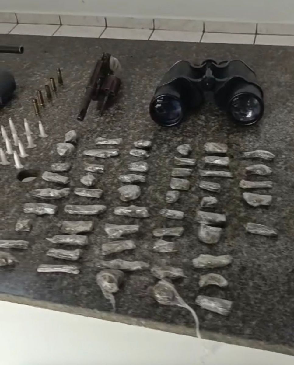 Durante a ação, os policiais apreenderam uma carabina calibre 9mm, um revólver calibre .32, cerca de 520 gramas de maconha, 43 gramas de crack, 27 gramas de cocaína, dois binóculos, além de munições e estojos de diferentes calibres.