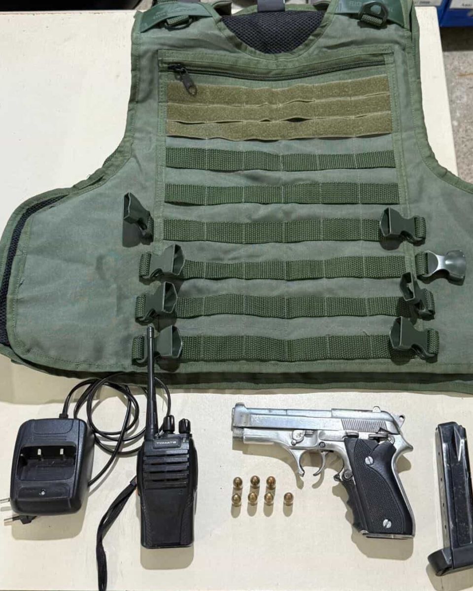Na ação, foram apreendidos uma pistola calibre .380, sete munições do mesmo calibre, um carregador, um rádio comunicador e uma capa de colete balístico.