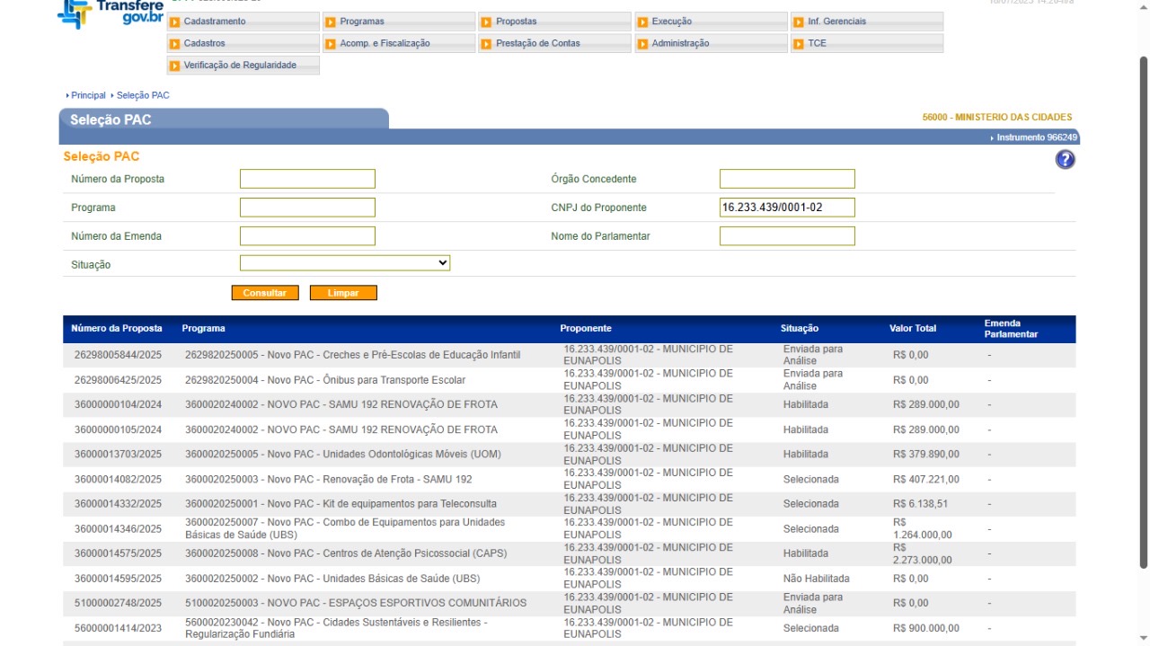 De acordo com informações oficiais da Secretaria Municipal de Saúde, sob a gestão da secretária Lívia Oliveira, ainda em 2025 o município de Eunápolis foi devidamente habilitado no programa PAC Saúde, iniciativa do Governo Federal, após a inserção de propostas técnicas feitas pela gestão municipal. Como resultado, Eunápolis foi selecionada para receber três importantes equipamentospara o fortalecimento da rede pública de saúde.