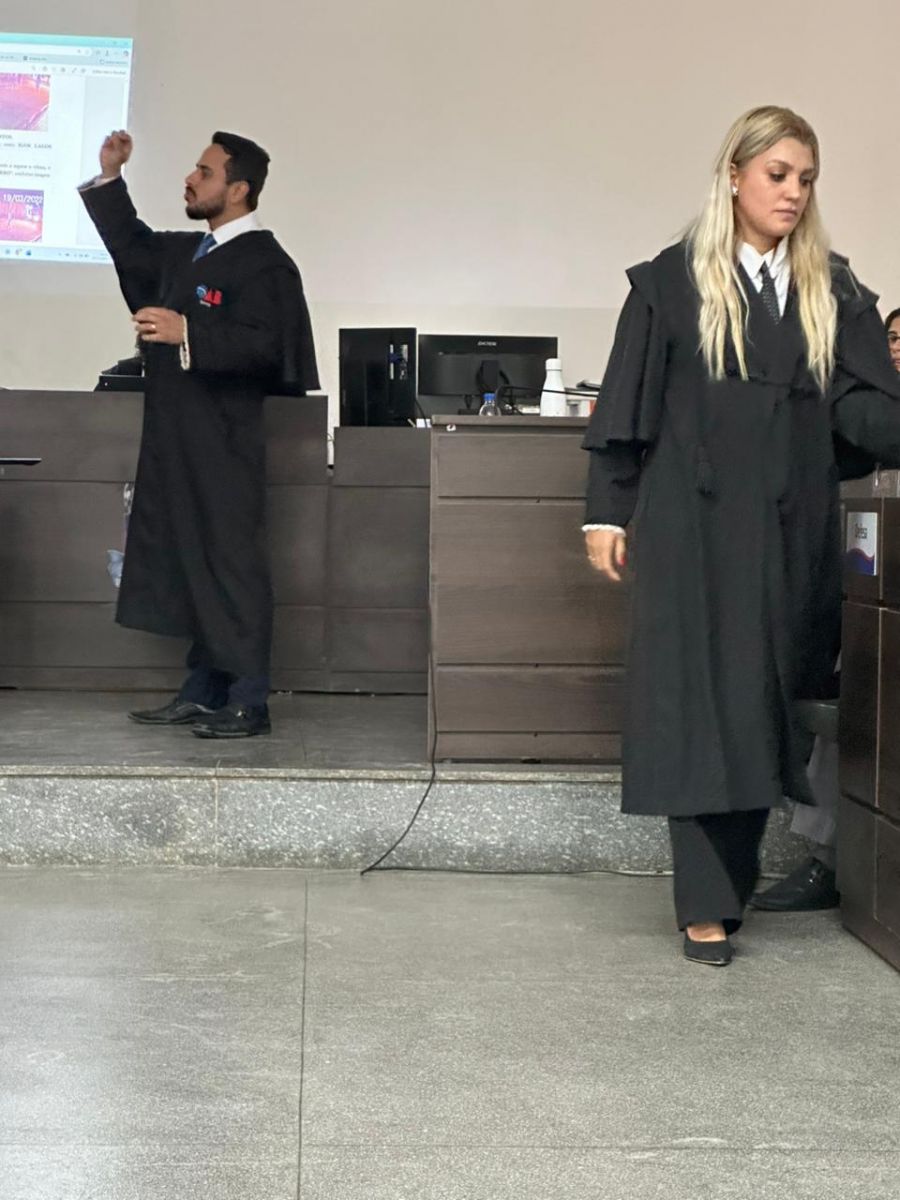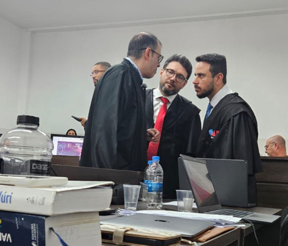 A defesa dos réus foi conduzida por uma bancada composta por oito profissionais, que atuaram de forma coordenada e técnica ao longo da sessão. O advogado criminalista Gutemberg Passos, renomado na região pelo trabalho em Tribunais do Júri, liderou a equipe, tendo ao seu lado a estagiária de júri Dra. Michelle Passos, que desempenhou papel ativo na elaboração das teses defensivas e no acompanhamento da sessão, bem como suporte jurídico de sua equipe do escritório através do Dr Matheus França e Dr Gustavo Leal.