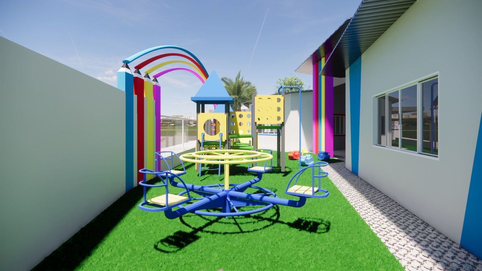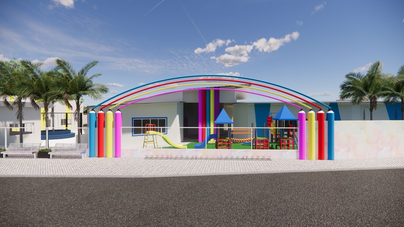 A obra inclui ainda pátio coberto com playground, área externa de lazer, ambientes de descanso, cozinha equipada, setor exclusivo para preparo da merenda escolar e lavanderia.