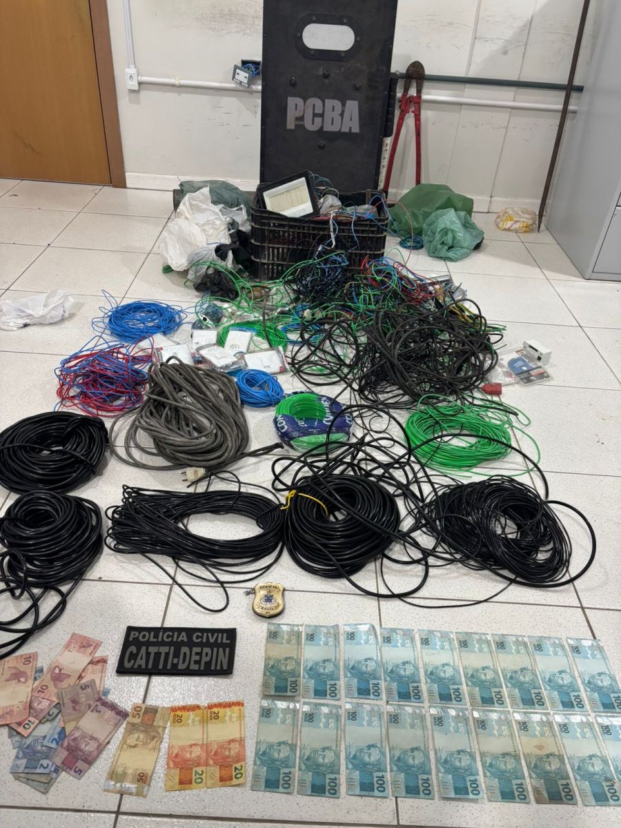 No local, foram encontrados diversos cabos com as mesmas características descritas pela administração do condomínio. Além dos cabos, a polícia também apreendeu R$ 1.964 em espécie, quantia cuja origem será esclarecida no decorrer das investigações. Todo o material foi encaminhado para perícia, que deverá confirmar a procedência e auxiliar na restituição aos proprietários.
