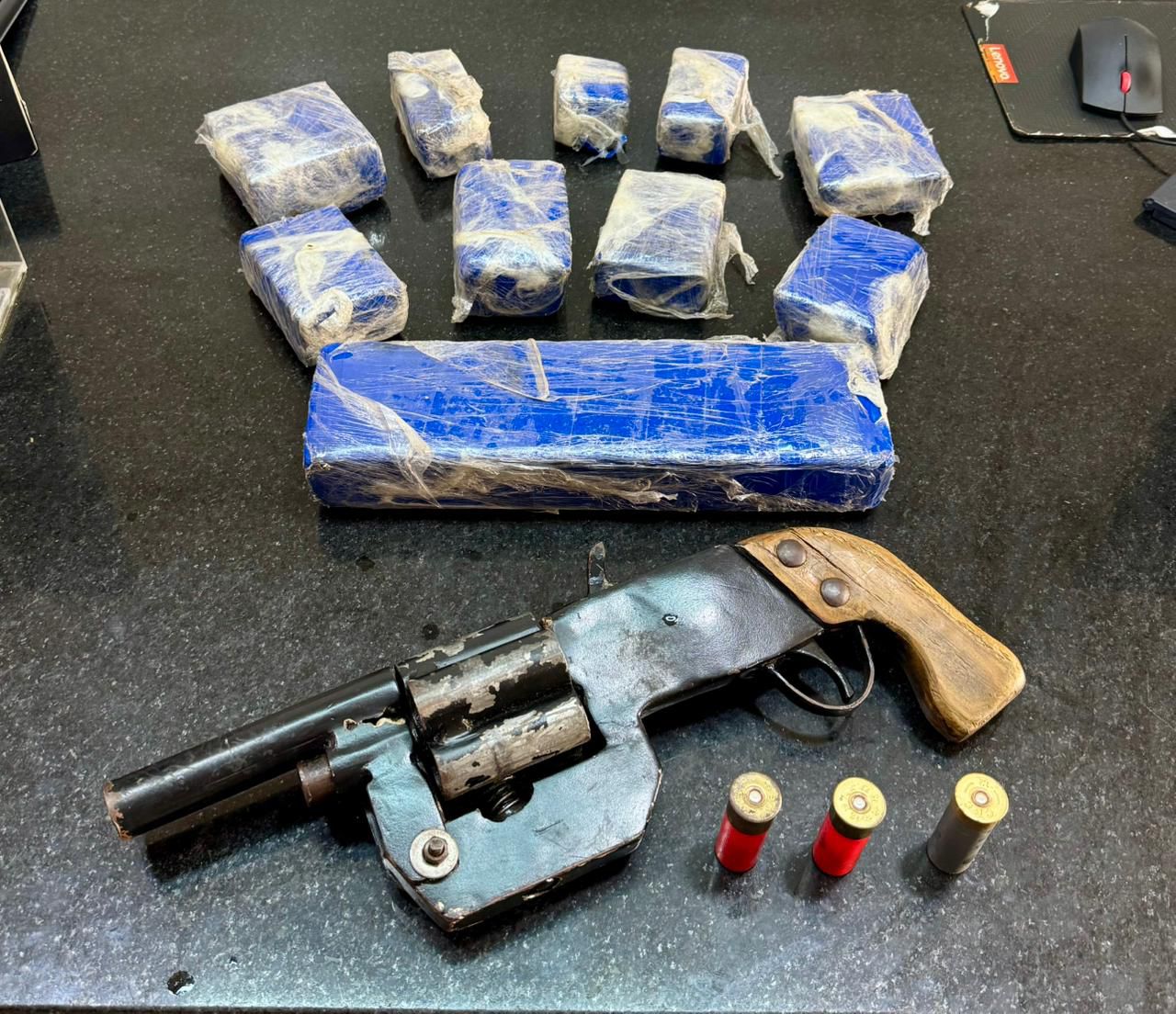 Durante a operação foram apreendidos uma espingarda calibre 12, três munições do mesmo calibre e cerca de 2,5 quilos de maconha, divididos em dez tabletes.