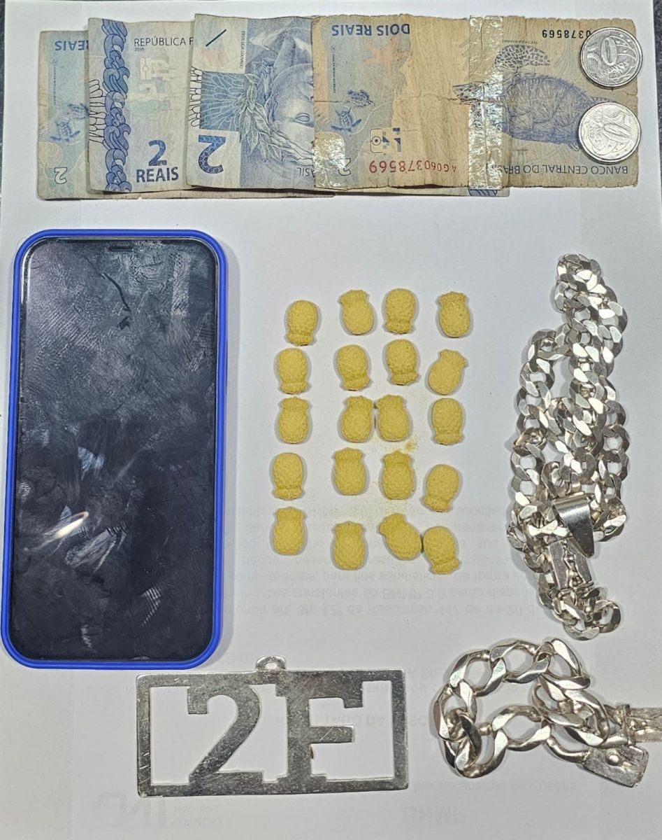 Foram apreendidos 20 comprimidos de ecstasy, um iPhone 12, uma corrente, uma pulseira e um pingente de cor prata, além de R$ 9 em espécie.