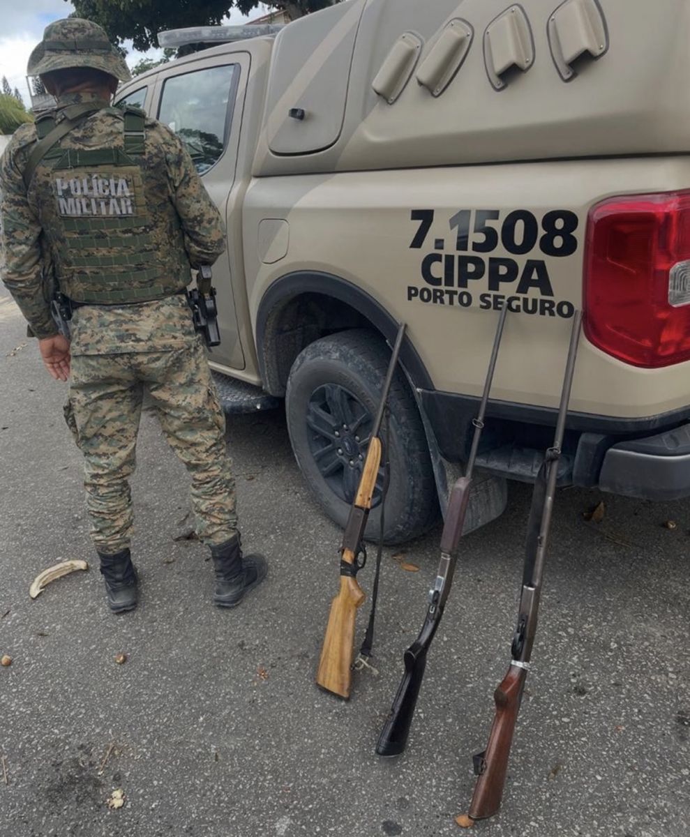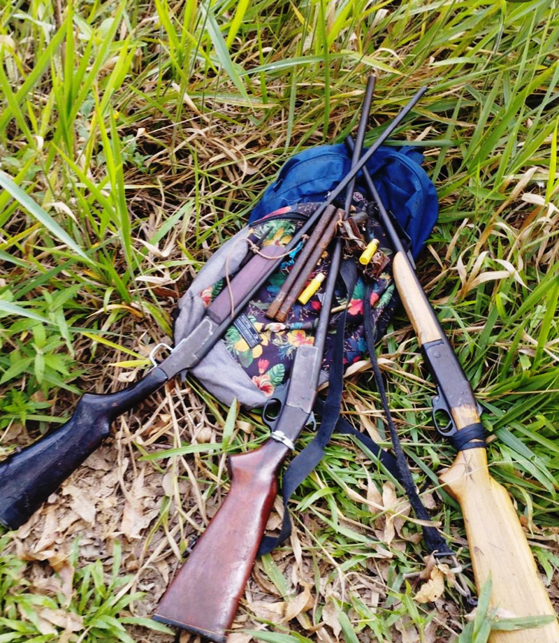 Diante da alta densidade da vegetação, não foi possível dar continuidade ao acompanhamento dos suspeitos. No entanto, durante as buscas, os policiais localizaram uma mochila abandonada contendo três espingardas — calibres 32, .40 e 20 — além de cartuchos e outros insumos comumente utilizados na atividade de caça.