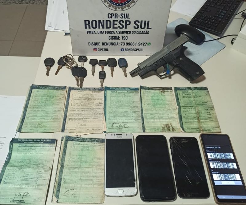Na ação policial foram apreendidos; uma motocicleta Honda Biz placa PKT 1031, um carro modeleo GM/Prisma placa EAI 2437 que foi utilizado pelos bandidos no assalto, sete documentos diversos de veículos, nove chaves diversas de veículos, uma pistola de ar comprimido e quatro aparelhos de celular.