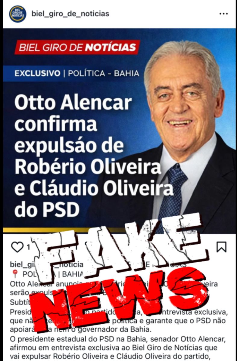 O senador Otto Alencar (PSD) divulgou um vídeo para desmentir uma fake news que vinha sendo compartilhada em páginas do Instagram, afirmando, de forma falsa, a saída de Robério Oliveira e da deputada estadual Cláudia Oliveira do Partido Social Democrático (PSD).
