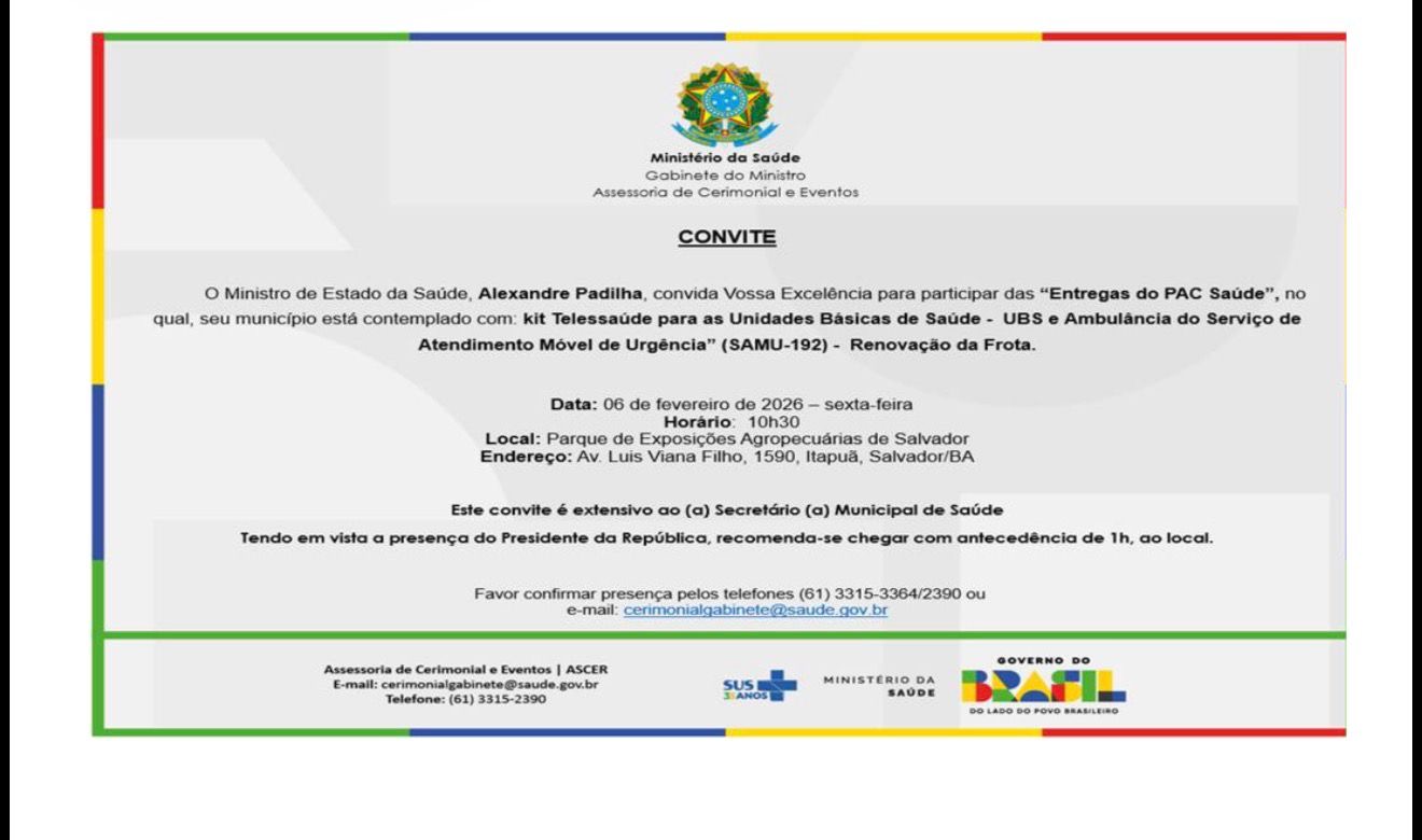 Na próxima sexta-feira, o prefeito Robério Oliveira estará recebendo, diretamente das mãos do presidente Lula, acompanhado do ministro da Saúde, Alexandre Padilha, uma ambulância do SAMU 192 e um kit completo de equipamentos para teleconsulta.